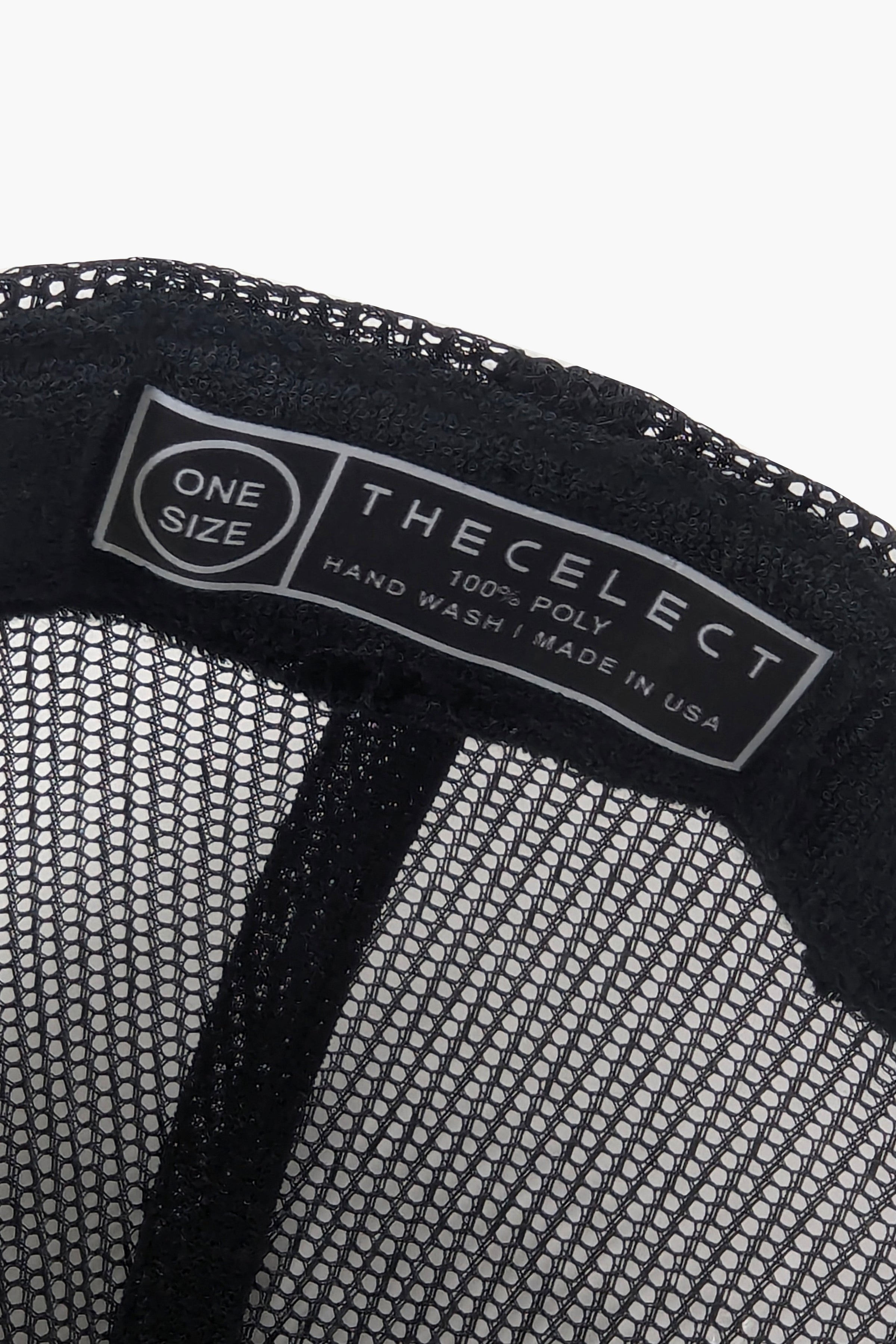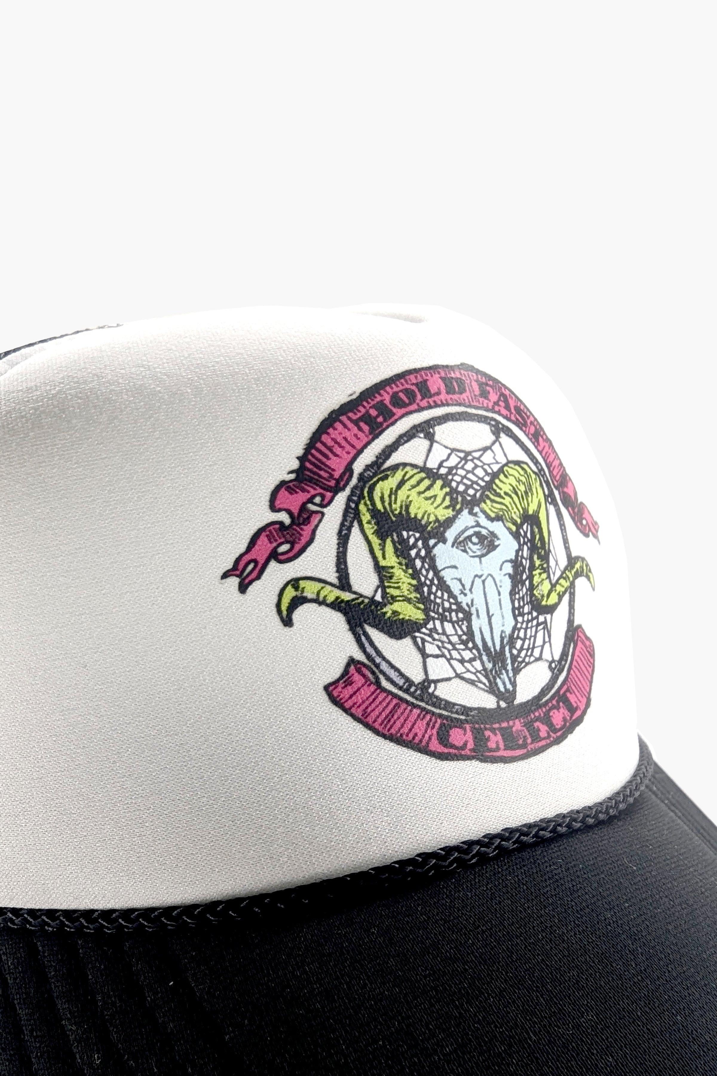 This high rise trucker hat offers breathability with its mesh back and comfort with a soft terry band inside. It features unique hand drawn skate-inspired art. Made in LA.