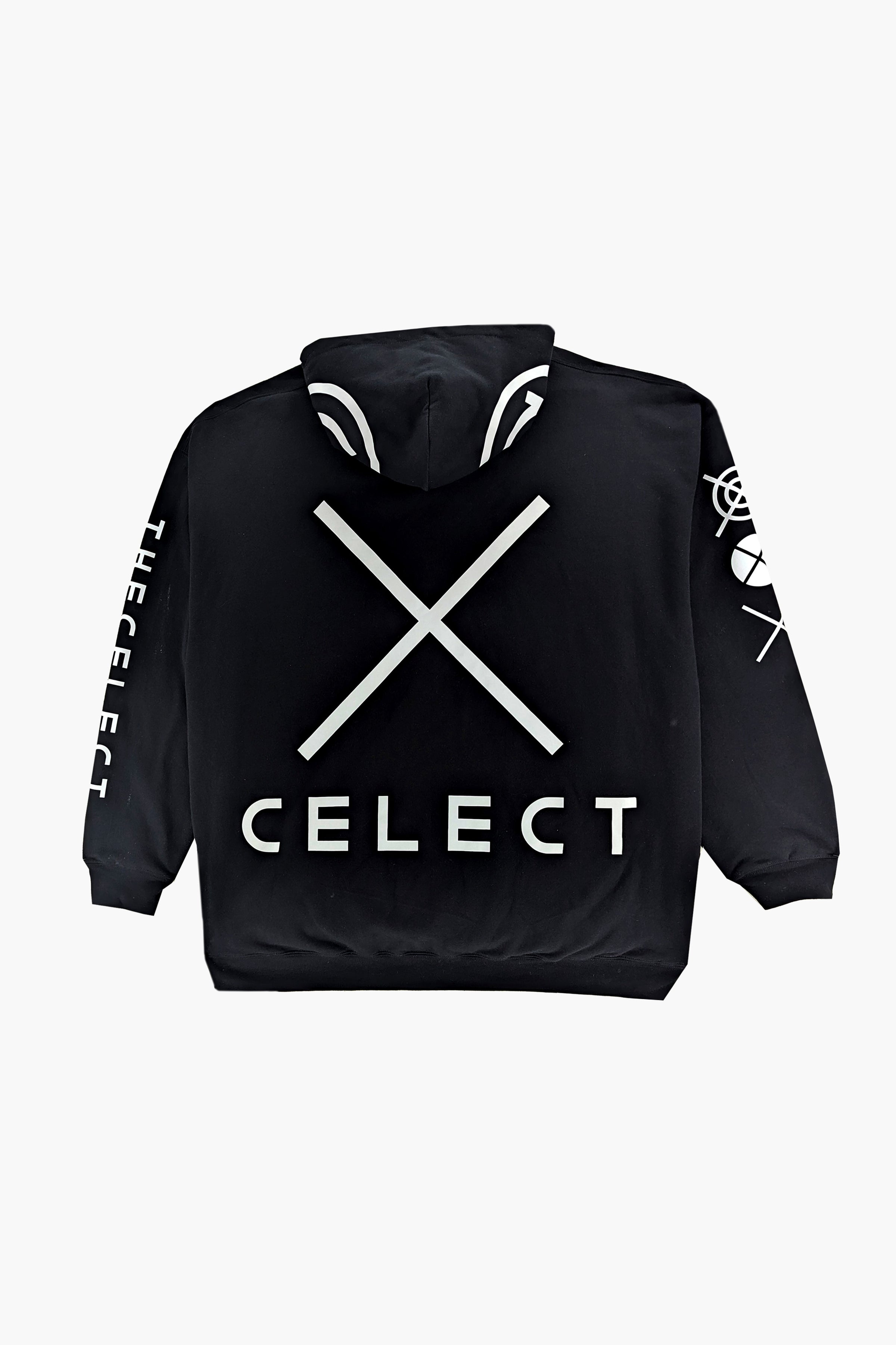 This hoody showcases various artworks, including a prominent large X circle logo at front, a striking "THE CELECT" design at back, a "C" and "@" emblem on the hood, and several logos along the sleeves. Crafted from 280 gsm fleece. Made in LA.