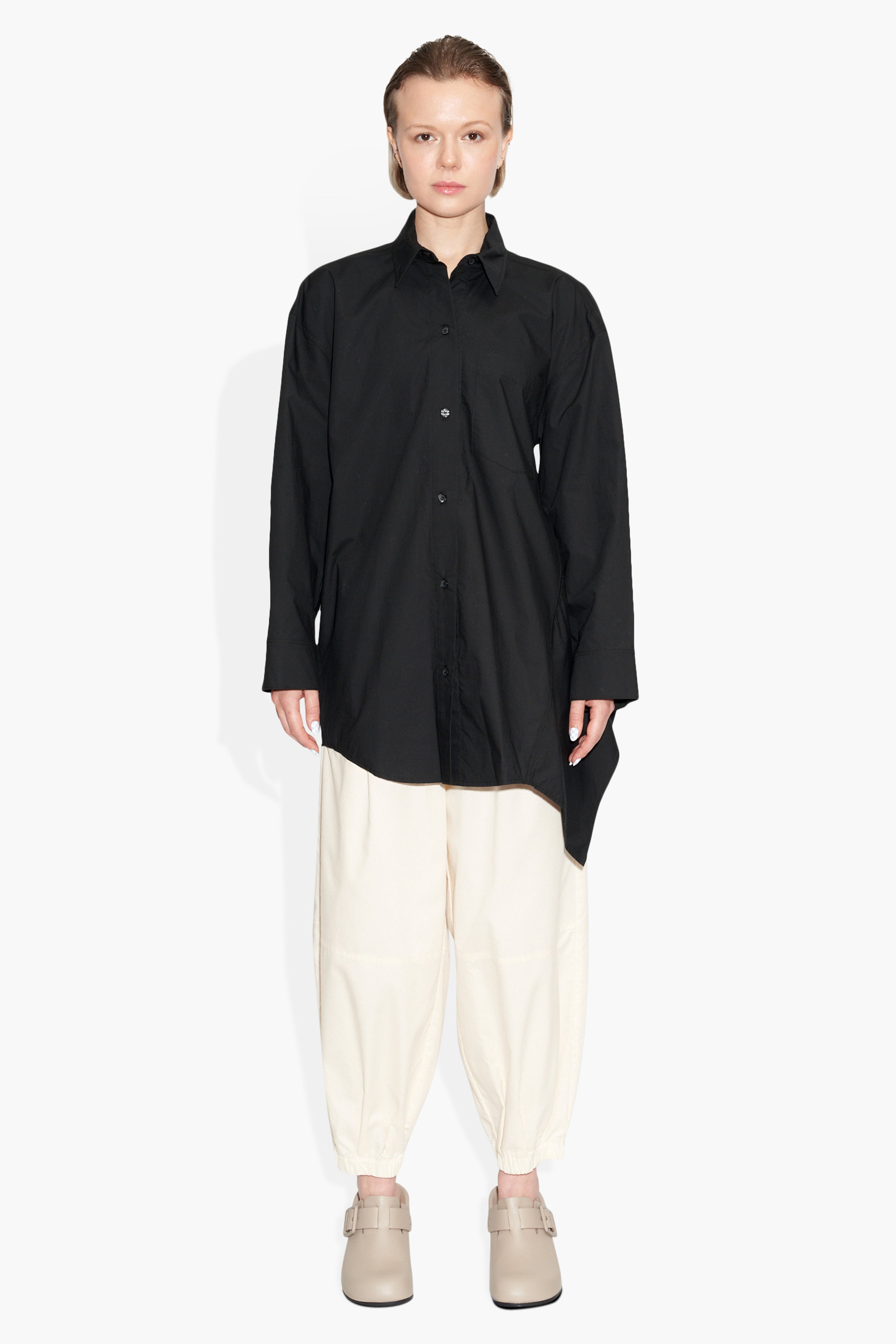 This timeless black cotton shirt is redesigned with an asymmetrical drape detail along the side, paired with a relaxed oversized fit. Made from 100% cotton and crafted in Los Angeles, it combines comfort with contemporary style.