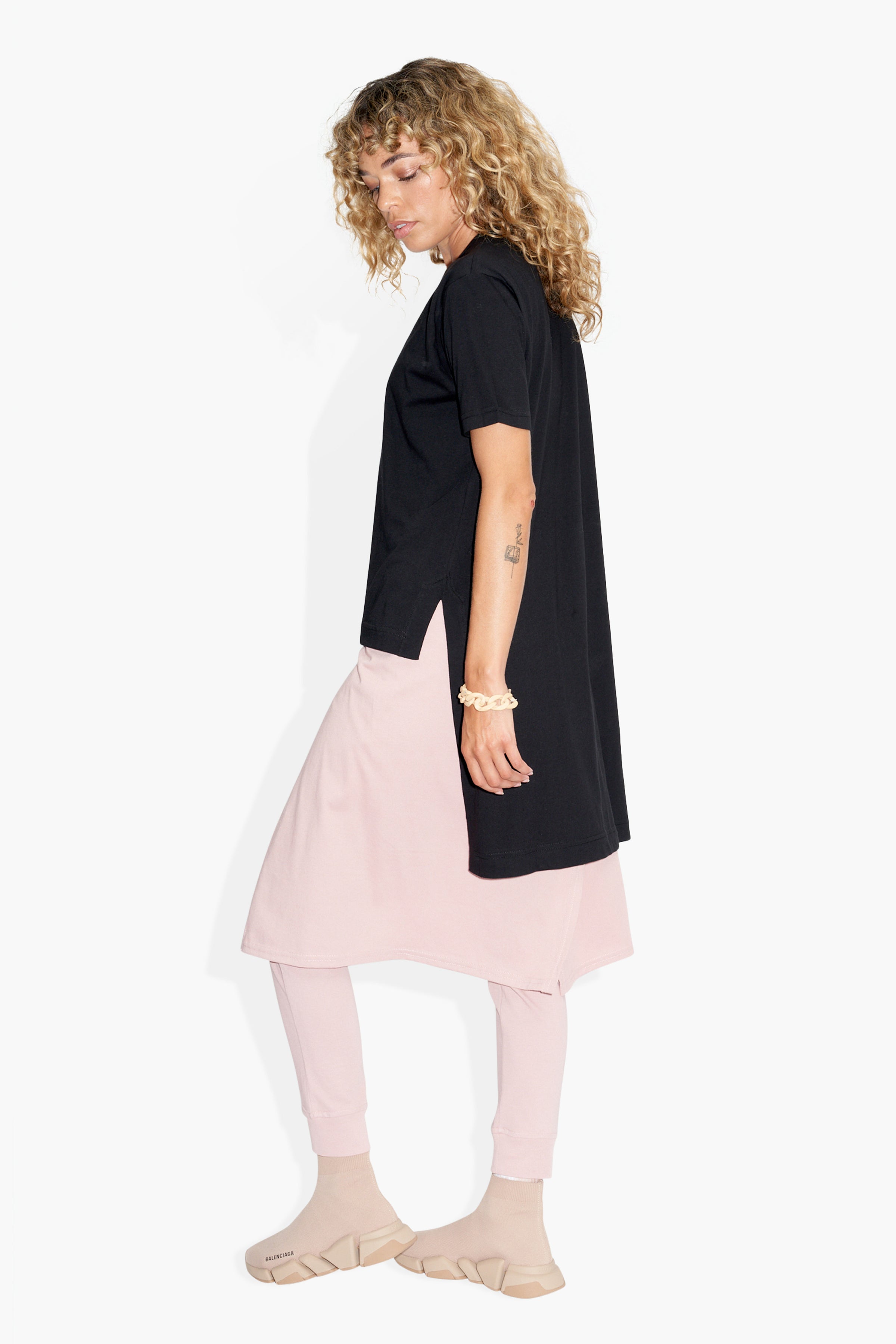 This black crewneck tee features short sleeves and an extended back hem for a modern touch. Crafted from 100% cotton jersey at 155 gsm. Proudly made in Los Angeles.