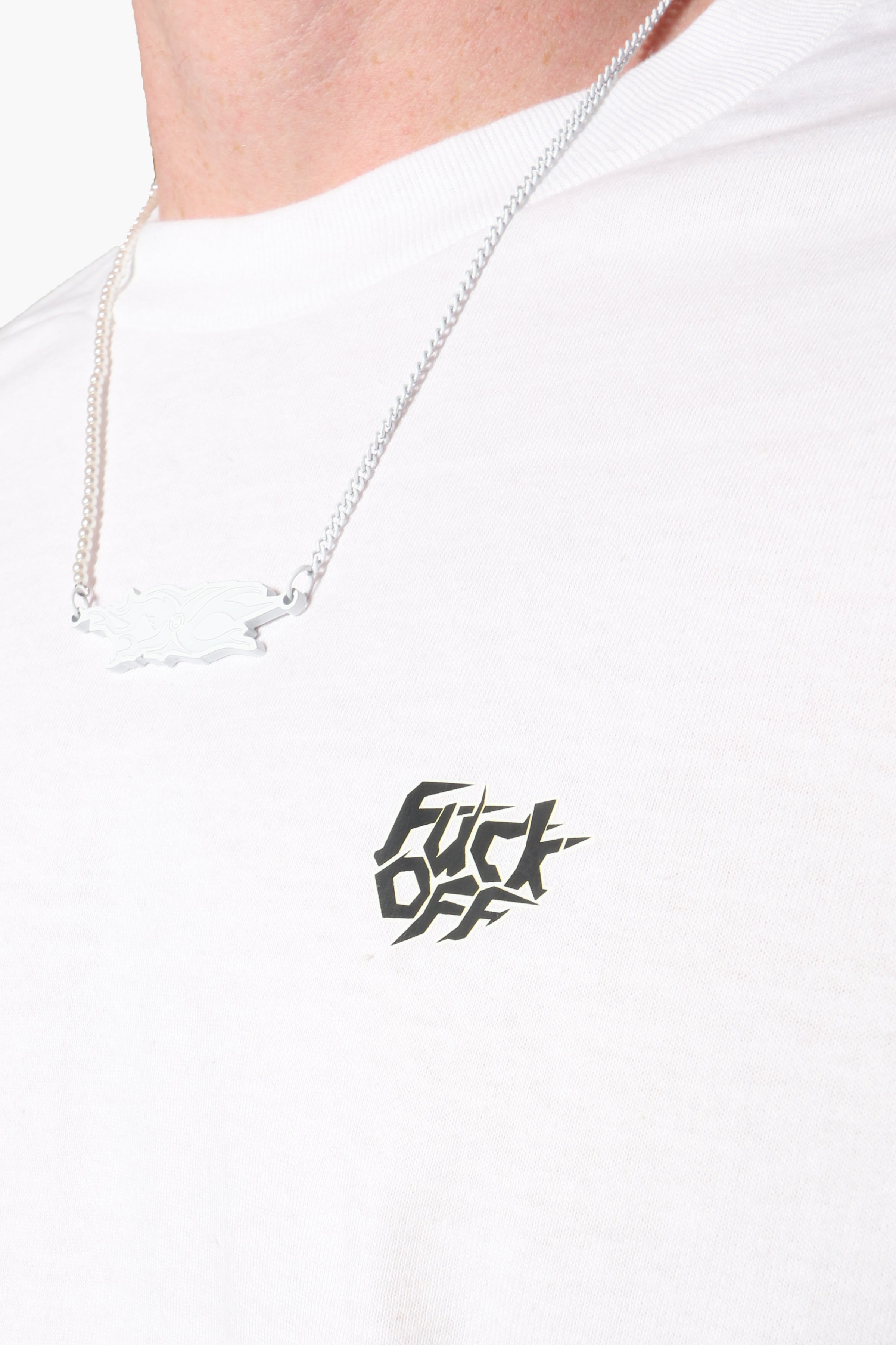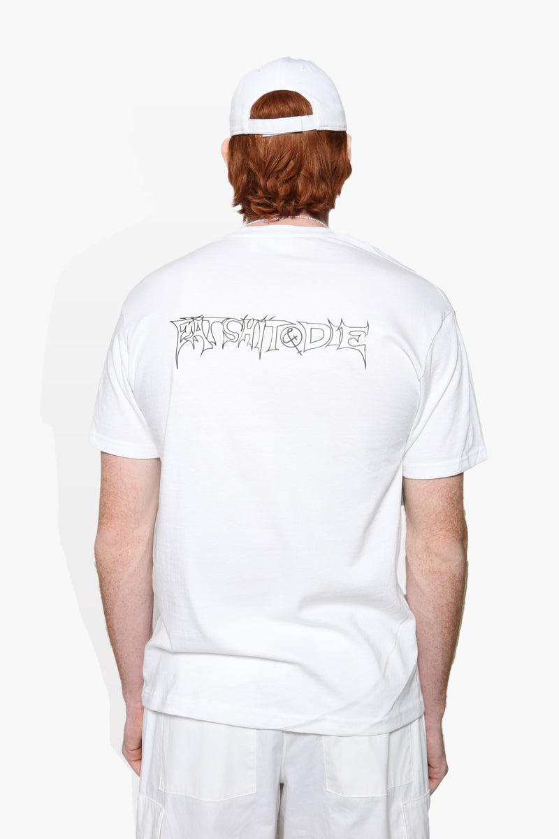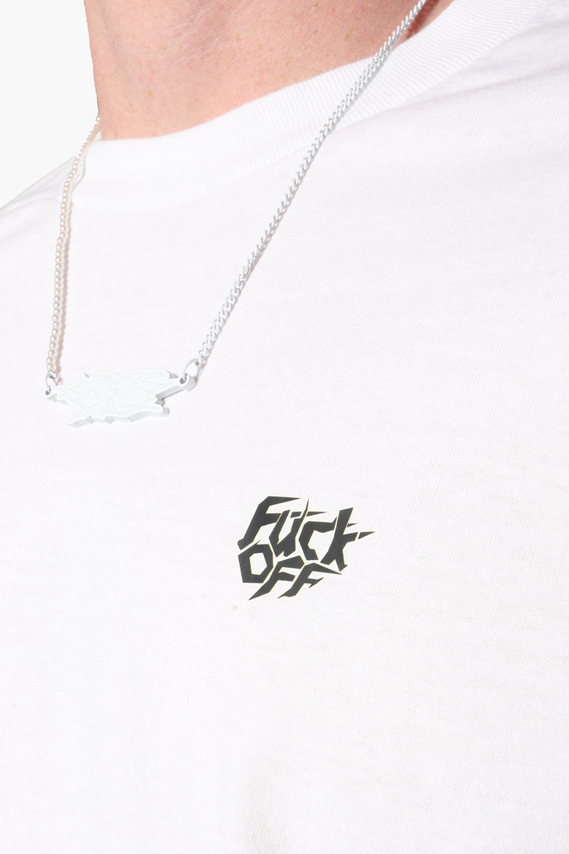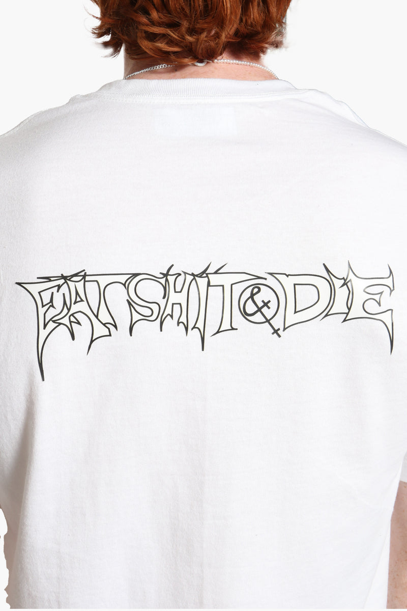 F*CK OFF T printed front chest and back "EAT SH*T AND DIE" on regular fit T shirt. 100% cotton. 6 oz. Made in Los Angeles.