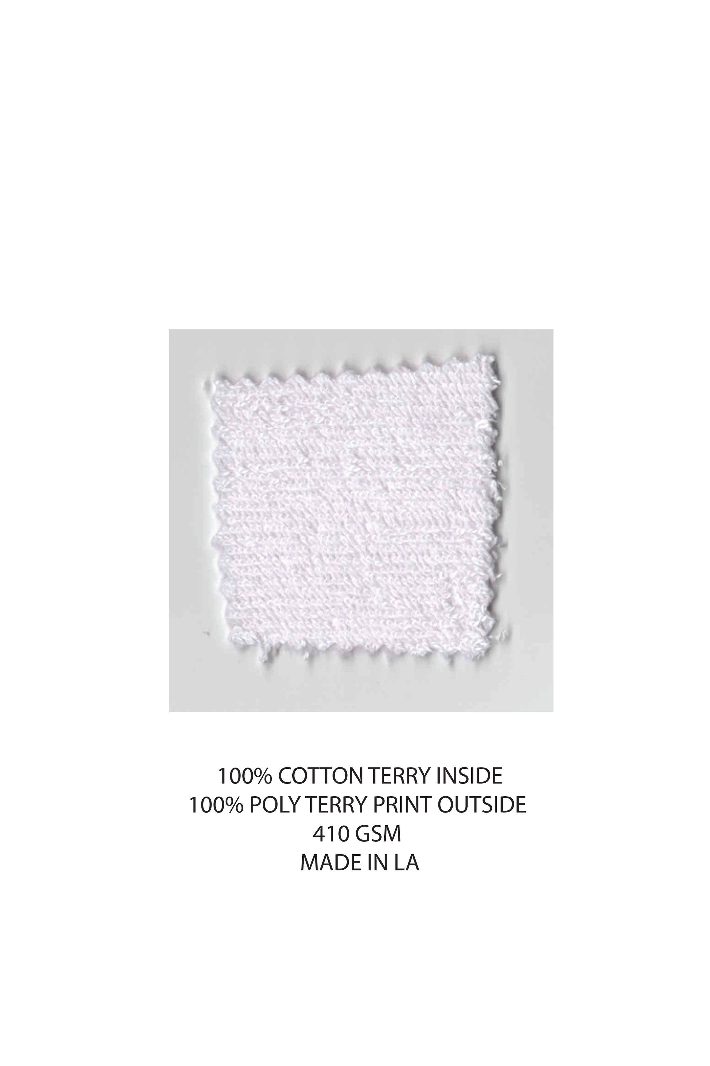100% Cotton inside / 100% polyester printed outside. 410 GSM. Printed denim pant is for fit reference. Made in LA.