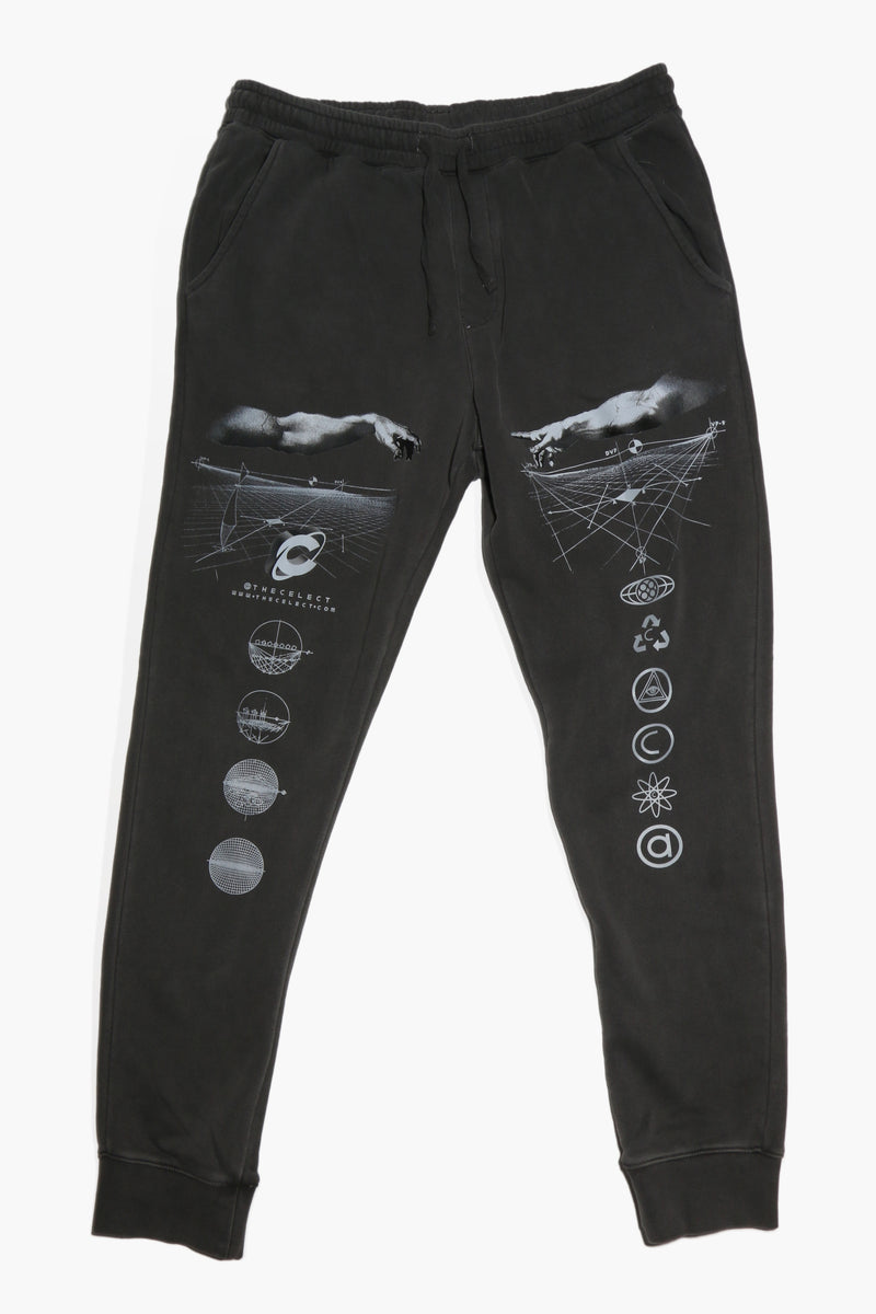 Perspective graphic on fleece pant. Ribbed cuff around ankle. Side entry pockets and back pocket. Garment Dyed. 280 GSM fleece. 80% Cotton | %20 Poly